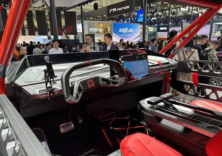 內飾方面,M-HUNTER的設計同樣簡約而直觀。紅黑色的內飾設計激發出一種激情澎湃的氛圍,而不規則的方向盤和桶形座椅的設計不僅增加了駕駛樂趣,也提高了車輛在極端條件下的操控性。所有的功能幾乎都集中在懸浮式中控屏上,減少了內部的復雜元素,使得駕駛更為專注和純粹。