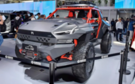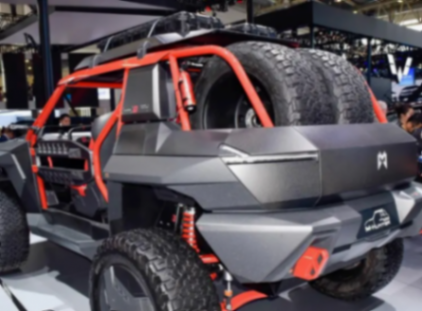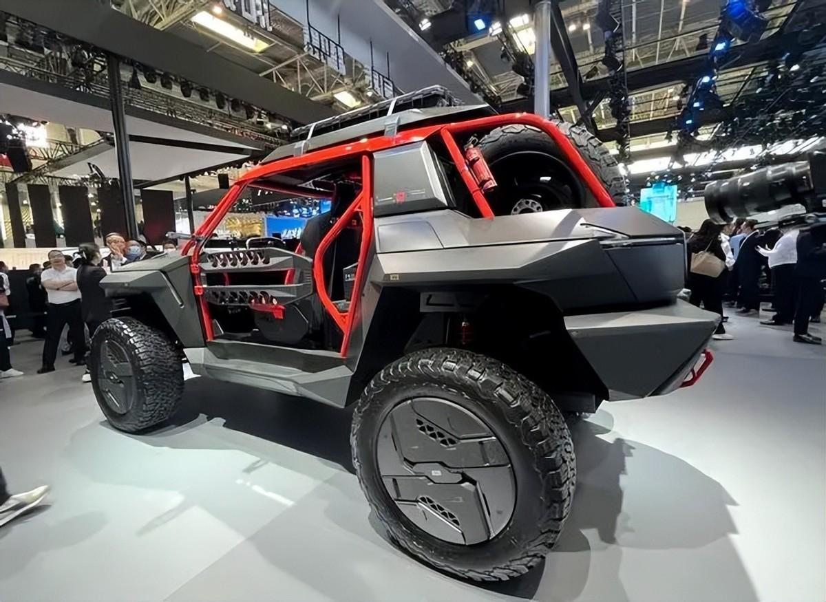 車輛采用全包裹式桶形運動座椅,提供良好的支撐,同時內飾設計簡約卻具未來感。方向盤設計不規則,搭配推式擋把和三角形元素的設計,座椅采用紅色以增強越野氛圍。內飾采用黑紅配色,金屬框架設計展示了一種力量感。