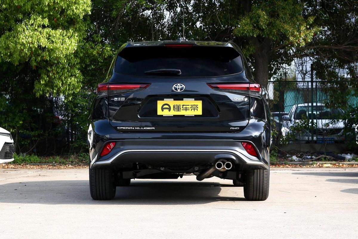 依托于車身側面的多條腰線,讓皇冠陸放在視覺呈現上更加流暢修長。車頂上方安裝有行李架,車窗的連接部分也進行了黑化處理,配合上大尺寸的多幅式分色輪轂,整體視覺效果十分酷炫。車尾的設計也同樣擁有吸引力,車頂上方不僅有鯊魚鰭,還配備了運動尾翼,后尾燈與前大燈相呼應,下方的單邊雙出排氣配合上銀色的擾流板,使得車輛的運動氛圍得到了進一步的提升。