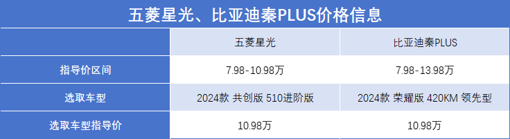 為了對比的公平性,咱們也選取兩臺車的價格接近的車型進(jìn)行對比,并且咱們今天主要以純電版車型為例開展對比,即五菱星光 2024款 共創(chuàng)版 510進(jìn)階版、秦PLUS 2024款 榮耀版 420KM 領(lǐng)先型(下文分別簡稱:星光EV、秦PLUS EV),二者的指導(dǎo)價均為10.98萬,咱們也以這兩款車型為例,展開對比。