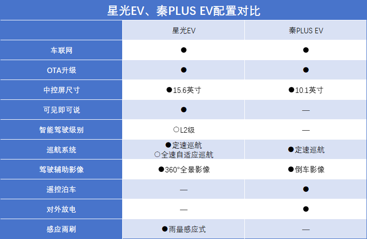 其次,星光EV和秦PLUS EV都能實(shí)現(xiàn)定速巡航功能,但星光EV還能選裝L2級智能駕駛輔助系統(tǒng),在中長途出行過程中,便捷性要好一些;常規(guī)配置方面,星光EV多出了感應(yīng)雨刷、360°全景影像功能。整體來看,星光EV的配置更為豐富,秦PLUS EV只能說是夠用。