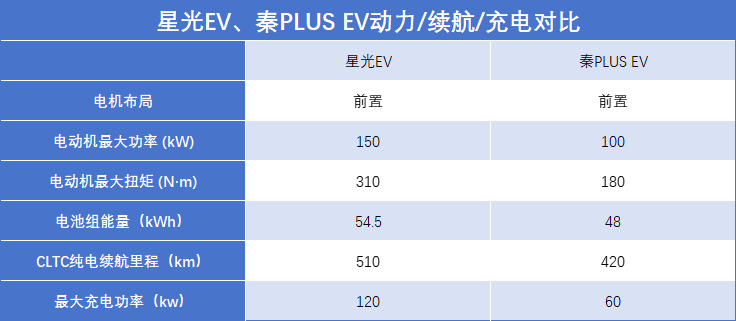作為純電動車型,純電續(xù)航里程、動力表現(xiàn),以及充電效率都是關(guān)鍵指標(biāo),咱們也來看看星光EV、秦PLUS EV的表現(xiàn)及差異。動力結(jié)構(gòu)方面,星光EV、秦PLUS EV各自都配備了一臺前置驅(qū)動電機(jī),而星光EV的電動機(jī)最大功率為150kW,最大扭矩為310N·m,秦PLUS EV的最大功率為100kW,最大扭矩為180N·m,星光EV的動力會有明顯優(yōu)勢,應(yīng)付國道、高速超車等場景,會更得心應(yīng)手。同時,星光EV的最高車速為160km/h,秦PLUS EV僅為130km/h,前者的優(yōu)勢依舊明顯。