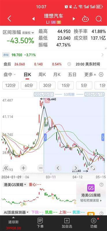 公開信息顯示,截至5月15日,理想汽車美股,較3月1日理想MEGA上市之初,其股價(jià)跌幅已經(jīng)達(dá)到43.5%,跌去近200億美元市值。5月15日,美股盤后,理想汽車收?qǐng)?bào)25.92美元/股。