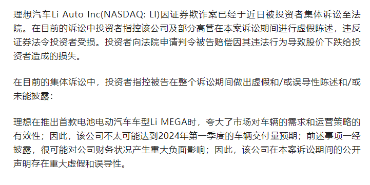 李想還沒等來預(yù)想中的光明,反而先等來投資者在美股的集體訴訟。對(duì)此,理想方面回應(yīng)稱,確實(shí)存在相關(guān)訴訟,但指控毫無依據(jù),會(huì)全力保護(hù)公司和股東利益。