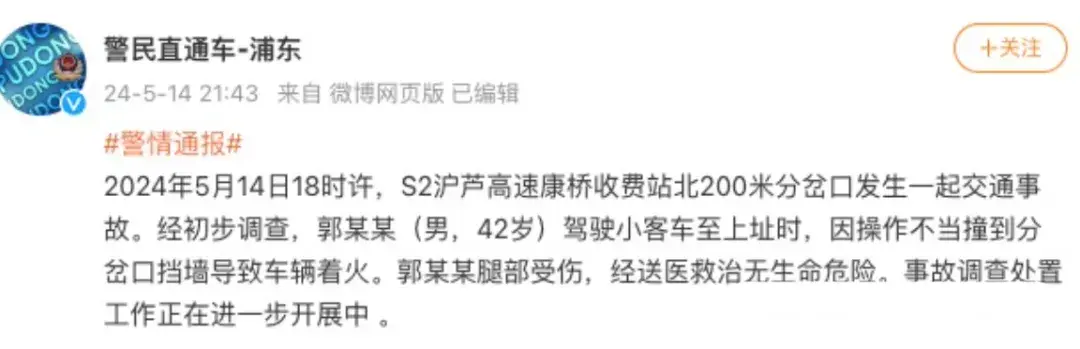 事故發(fā)生后,警方迅速介入調(diào)查。根據(jù)@警民直通車-浦東于5月14日晚發(fā)布的通報(bào),事故發(fā)生的具體時間為18時左右。經(jīng)初步調(diào)查,駕駛員郭某某(男,42歲)在駕駛過程中因操作不當(dāng),導(dǎo)致車輛撞擊分岔口的擋墻,隨后車輛起火。在事故中,郭某某腿部受傷,但幸運(yùn)的是,經(jīng)過緊急送醫(yī)救治,目前沒有生命危險(xiǎn)。警方表示,事故的調(diào)查和處置工作仍在進(jìn)一步開展中。