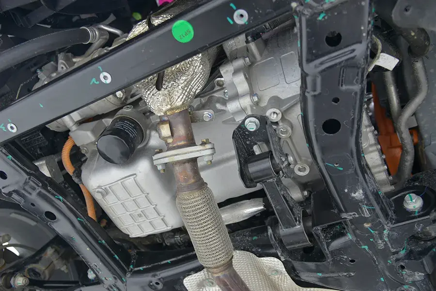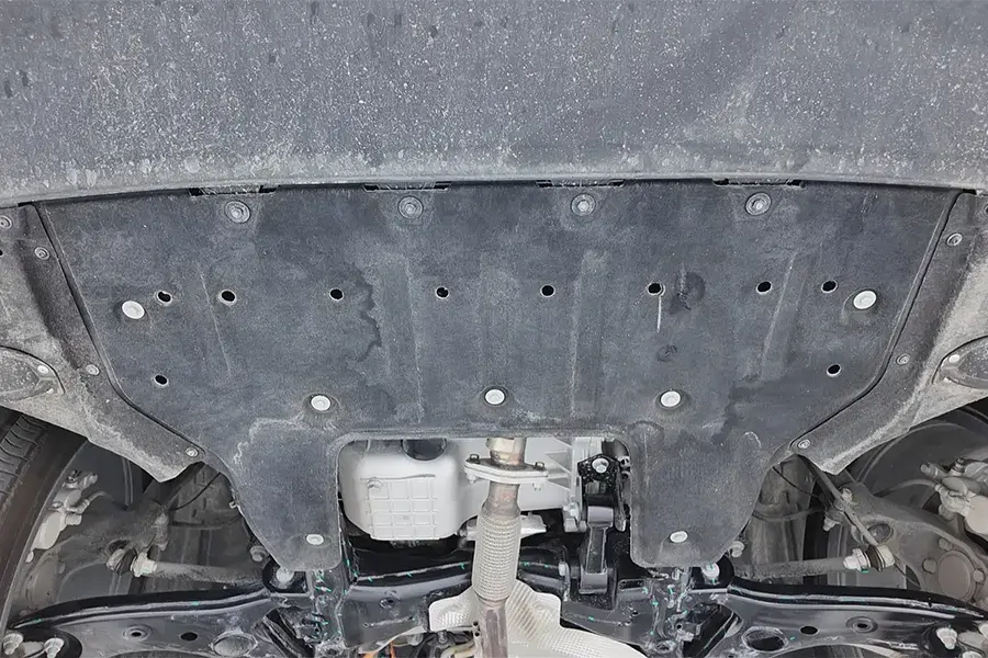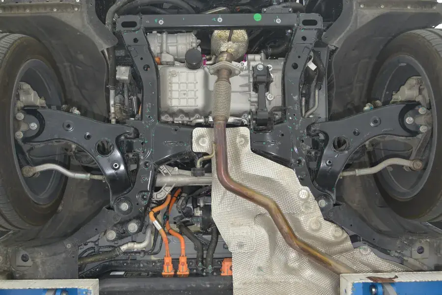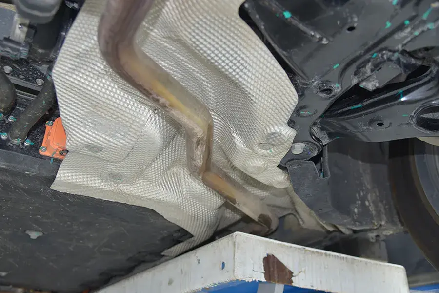 排氣管從電池組一側通過,隔熱護板比較齊全,沒有太多缺失。