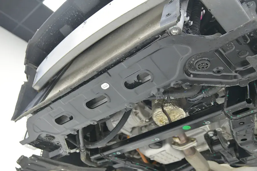 前副車架是全框式結構,雙層沖壓鋼板焊接而成。副車架前部呈“喇叭口”結構,在25%偏置碰撞測試中,能取得更好的成績。
