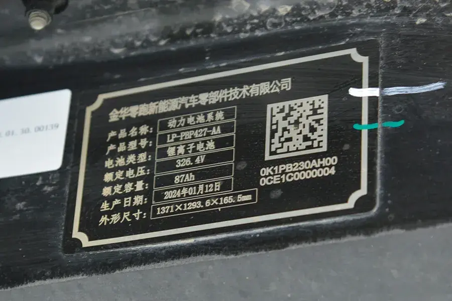 全系搭載磷酸鐵鋰電池,能量為28.4千瓦時,額定電壓326.4V,容量為87安時。電芯來自于國軒高科或中航鋰電,電池封裝是零跑自己完成。
