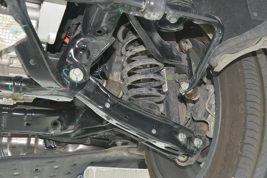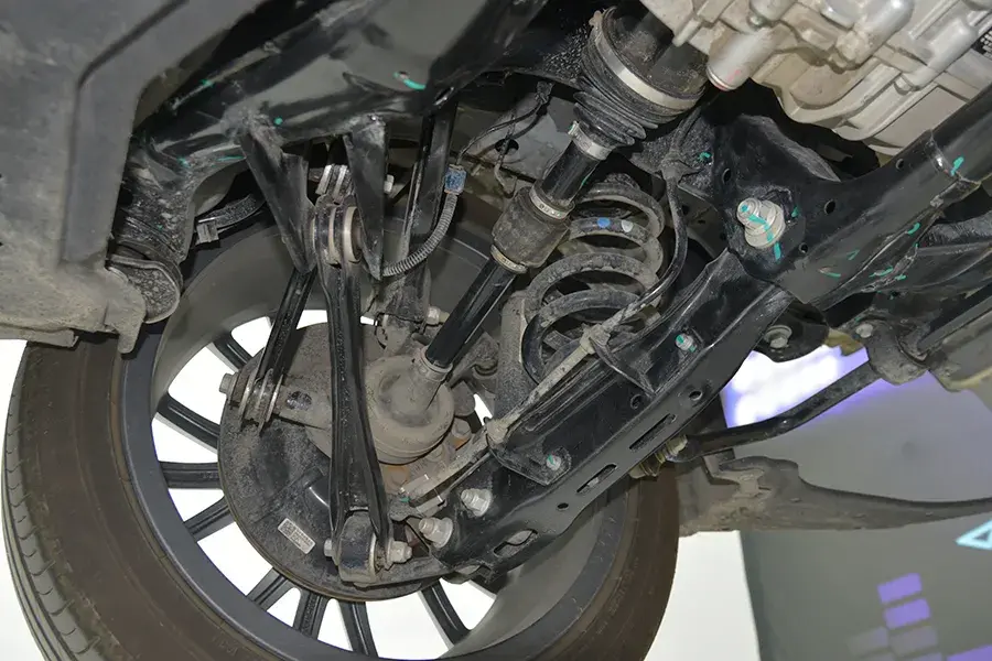 前懸是常見的麥弗遜結構,下擺臂是雙層沖壓鋼板,連接盤是普通的鑄鐵材質。