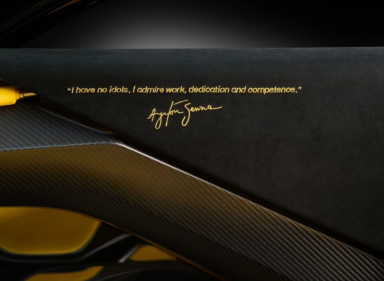 此外,車門處采用黑色Alcantara材質,上面印有塞納的簽名,以及他生前最喜歡的一句話:“我沒有偶像。我欽佩工作、奉獻和能力。”
