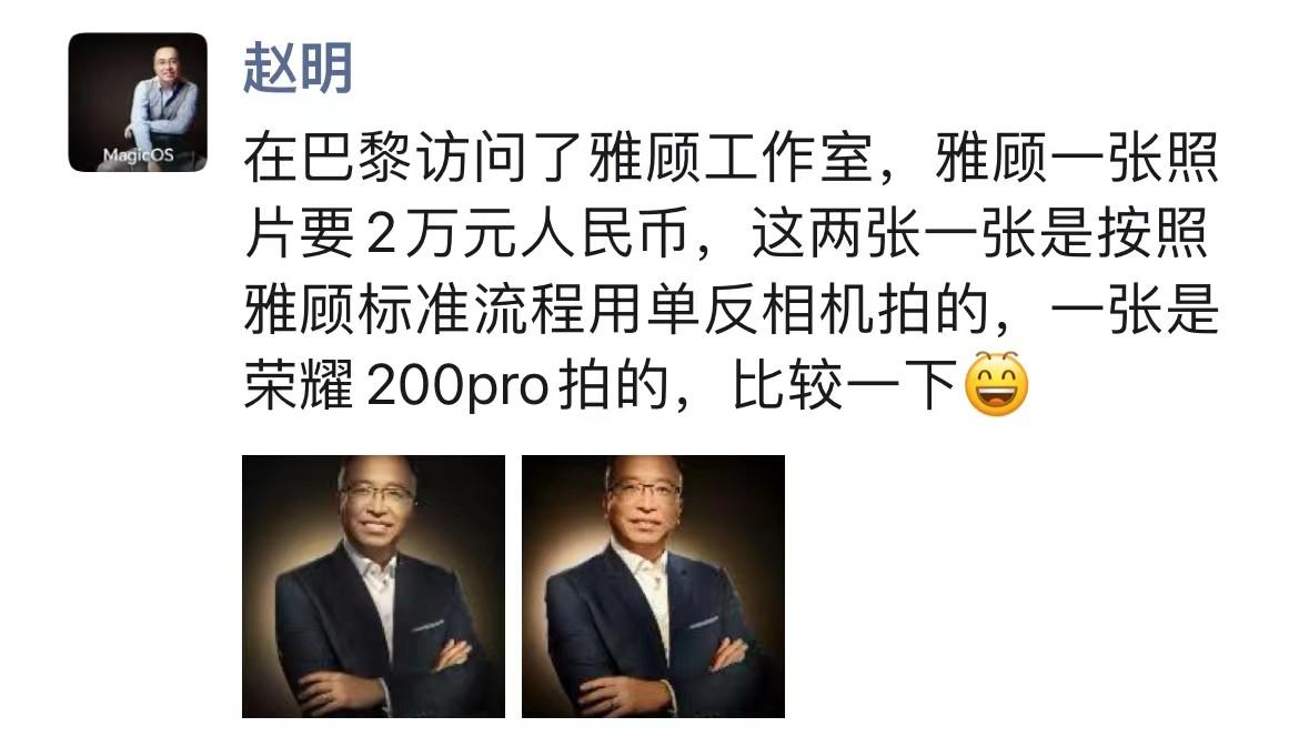 上半年新機發布的密集期到了,其中榮耀200系列、OPPO Reno新品都是行業關注的待發布新機。近日,榮耀CEO趙明微博發布兩張人像照,分別為專業攝影機構巴黎雅顧攝影工作室和榮耀200所拍攝。而令人意外的是,使用榮耀200系列手機拍攝的人像與雅顧價值2萬的作品效果幾乎無異,很難分出高下,在業界掀起了不小的波瀾。