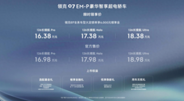 5月17日,領克07 EM-P三款車型——長續航Pro、Halo、Ultra正式上市,價格區間為16.98萬元至18.98萬元。領克宣布,新車自5月起將陸續交付,且為在2024年6月30日前下訂并完成大定鎖單的客戶,只要在7月31日前提車,將享受超過3萬元的限時優惠,并額外獲得6000元的置換補貼。