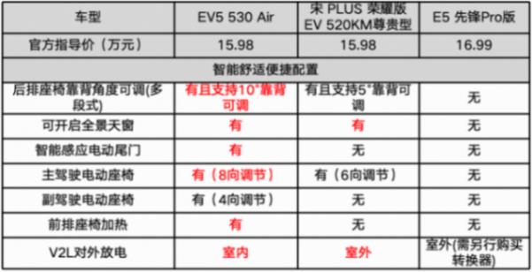 此外,三款車型中只有起亞EV5與宋PLUS EV提供了可開啟的全景天窗以優化艙內環境體驗,起亞EV5還會支持前排座椅加熱來應對冬季用車的舒適性。還需要補充的是,三款車都能通過V2L對外放電來實現功能拓展,不過,別克E5需要加裝轉換器,而只有起亞EV5支持室內放電與感應式電動尾門,用戶在進行戶外露營、或者野餐的時候,可以利用外放電來給電爐、熱水壺等用電器供電,非常實用。