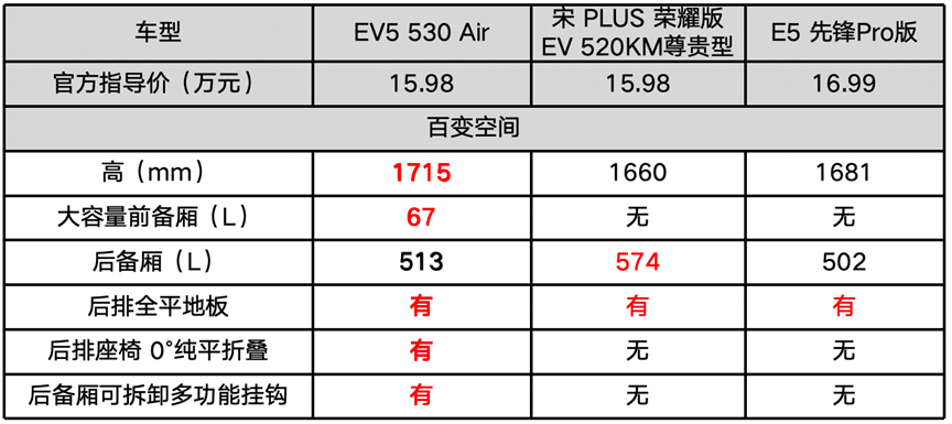 三款車型中,宋PLUS EV擁有最大的后備廂容積,別克E5的后備廂相對較小,而居中的起亞EV5則擁有三者唯一的67L前備廂,它除了能提供額外儲物支持外,對軟行李、食物等物品存放都會更方便。另外,起亞EV5的后排座椅靠背支持純平放倒,還在后備廂布局了可拆卸的掛鉤,不管是大件行李還是小物件,都能輕松放置。