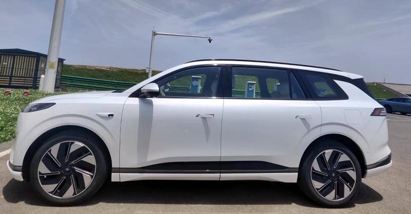 車(chē)側(cè)一面,新車(chē)的設(shè)計(jì)走向頗有些大眾ID.6的神韻;且在其相對(duì)不是特別具備攻擊性的側(cè)顏中,不僅有著輪廓清晰的前后輪眉,還有著自帶傾角的D柱,用以顯露出相對(duì)動(dòng)感的側(cè)顏?zhàn)藨B(tài)。