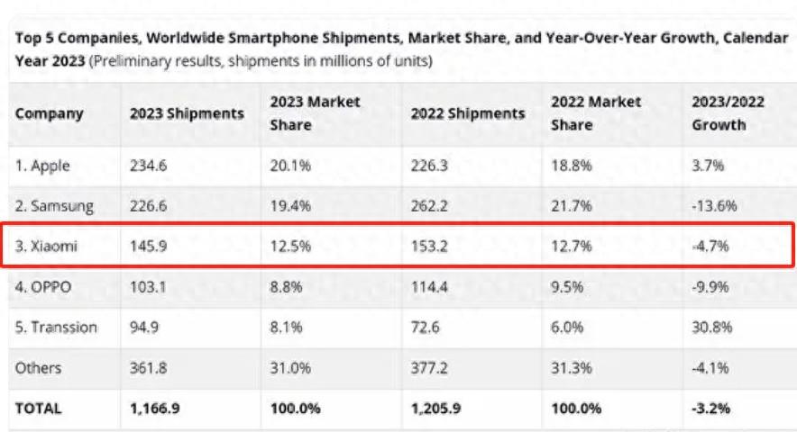 那絕對是小米,從2021年至2023年,小米一直穩坐全球第三名的寶座,按照2023年的數據顯示,小米以1.46億臺的銷量,拿下全球12.5%的份額,僅次蘋果、三星。