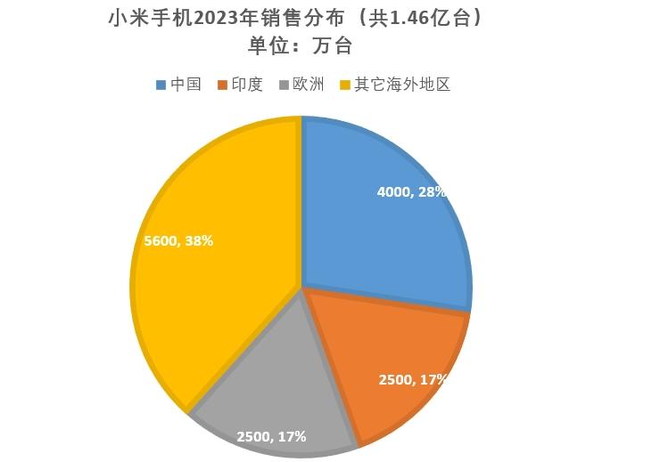 如上圖所示,這是根據各大機構的數據,得出的小米1.46億臺手機銷售分布圖,中國市場占比約為28%,印度市場約為17%,歐洲市場也約為17%,其它海外地區約為38%。