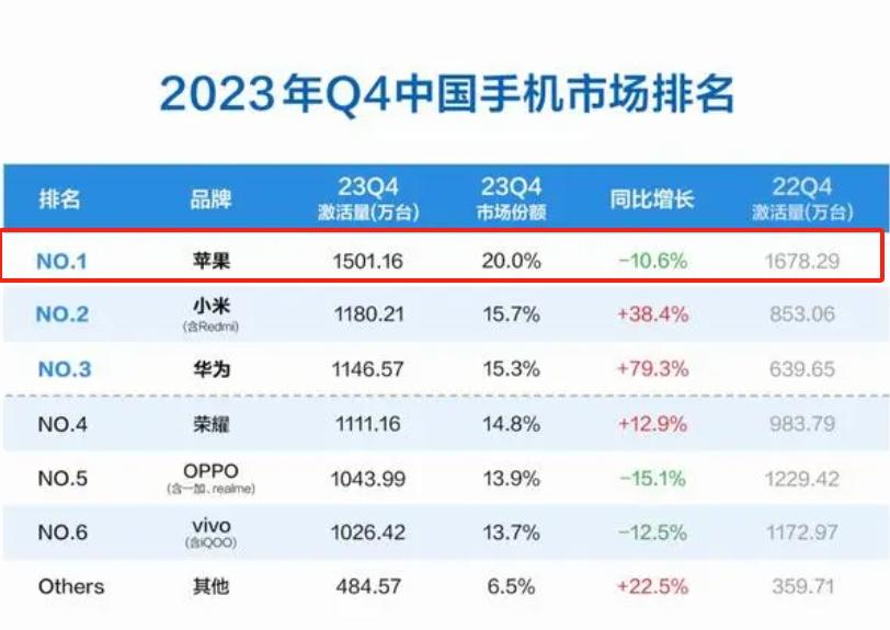 再看另外一份激活量數據,這是BCI的數據,顯示2023年4季度中國手機市場的激活量數據,可以看到蘋果是第一名,然后接著就是小米、華為、榮耀、OPPO、VIVO。