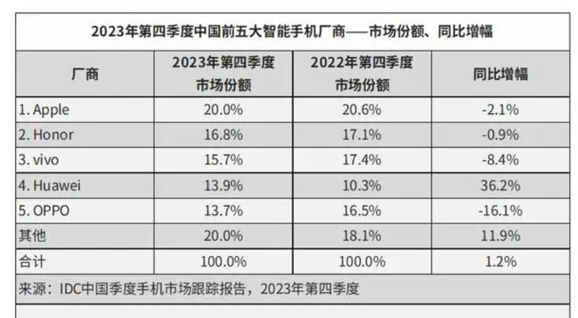 如下圖所示,IDC公布的中國市場前5大品牌,分別是蘋果、榮耀、VIVO、華為、OPPO,小米淪為“其它”,和其它廠商,一起分享剩下的20%。
