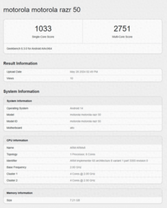 日前,moto razr 50手機現身GeekBench跑分庫。