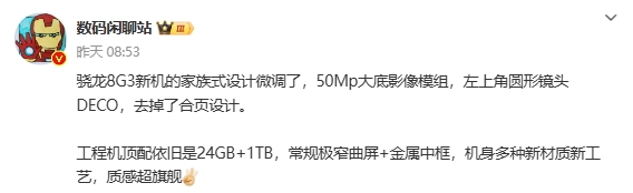 數碼博主@數碼閑聊站 今日的一份爆料中提到:“加加驍龍8G3新機,6.78"2780*1264p 1.5K BOE 8T LTPO,前置16Mp,后置50Mp大底主攝+8Mp+2Mp,百瓦超級大電池和新工藝質感機身都說過了”。