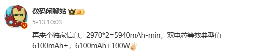 該博主還曾暗示,一加 Ace 3 Pro采用2970mAhx2“雙電芯”,容量等效典型值6100mAh±,同時支持100W有線充電。