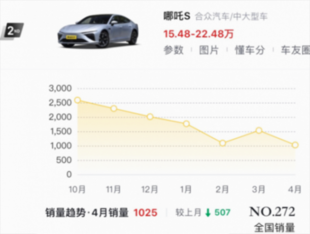 從2022年三季度至2024年4月,哪吒先后推出中大型轎車哪吒S,雙門跑車哪吒GT,中型SUV哪吒L等多款新車,單車價格倒是提上去了,銷量卻塌房了。哪吒現在售車型多達8款,月銷上萬卻變得越來越難。據第三方平臺顯示,哪吒S月銷最佳2500+,今年一季度月銷已滑到1000多臺,被寄予厚望的哪吒L在4月僅賣出1768臺。