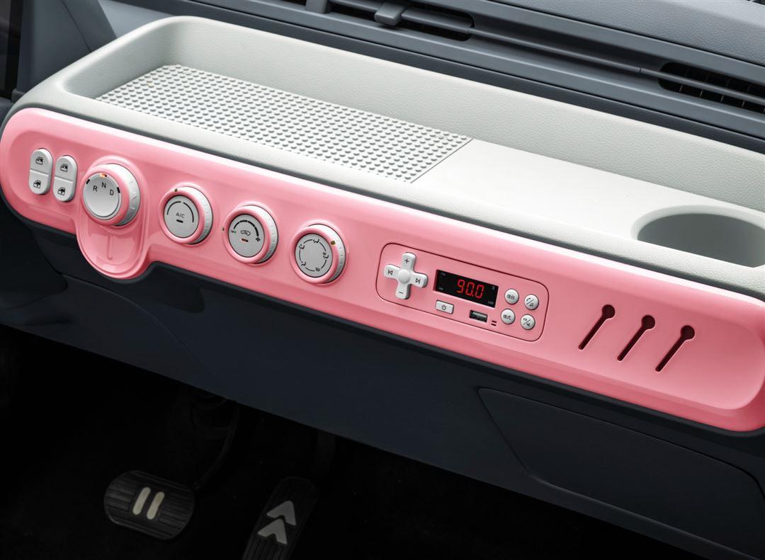 內飾設計方面小編覺得要比宏光MINIEV做的更討人喜歡,功能不多,都集中在中控臺上,用的都是物理按鍵,像車窗控制、電子旋鈕換擋、空調、收音機這些功能一目了然,而且還給你做出了一個游戲手柄的樣式,真的挺可愛的。除此之外,新車的剎車踏板采用音樂播放軟件的“暫停”符號設計,電門踏板采用游戲中的“加速”符號,很有創意。