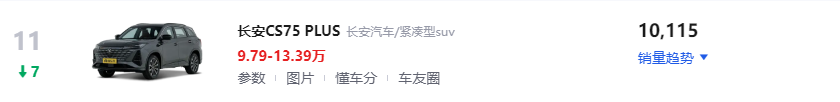那緊跟其后的,還有鋒蘭達、星越L、RAV4榮放,以及卡羅拉銳放等車型,而我想重點說下的,其實是在4月份跌至10名開外的長安CS75 PLUS,4月份,長安CS75 PLUS的終端累計銷量為10115輛,和3月份銷量相比,下滑了5116輛。而這,已經是長安CS75 PLUS連續第三個月銷量下滑了,危矣。