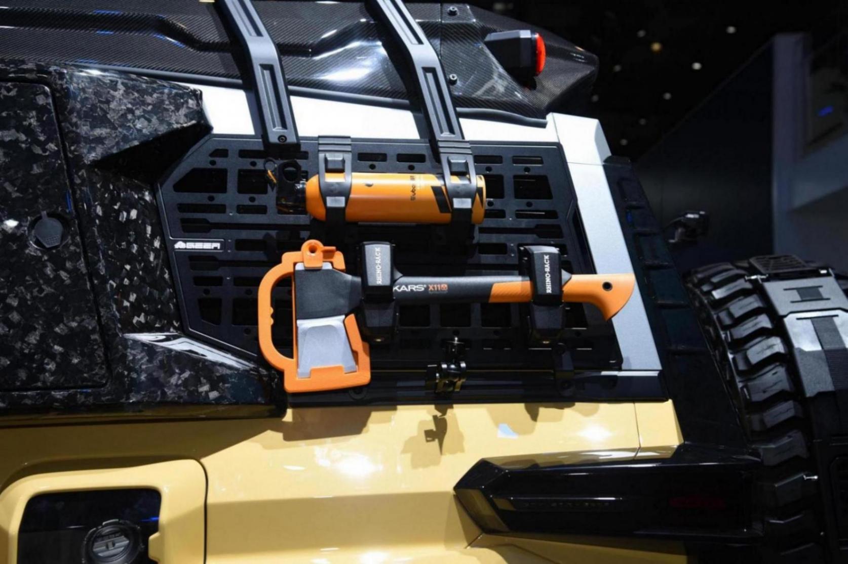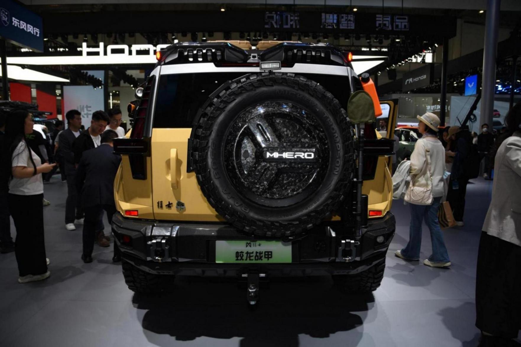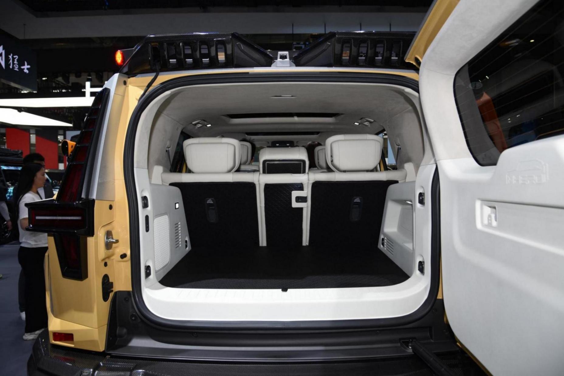 從側面看,車身腰線凌厲,前后翼子板凸起,提升整車的硬朗感。同時車子配備車頂擴展平臺,集成了示廓燈、營地燈、前射燈等,用戶也可以根據自己的需求進行個性化設定。并在C柱位置設置有掛架,現場展車的掛架上放置了消防斧、滅火器等物件。輪輞采用全封閉式旋翼鍛造,有不錯視覺體驗。車尾方面被配越野車常見的外掛式備胎,尾燈采用階梯式設計,有不錯的辨識度。在配色方面,整體使用官方稱之為“沙漠風暴黃軍事涂裝”風格,車輛上半部分為以銀色涂裝。作為參考。在售的猛士917車身長寬高分別為4987/2080/1935mm,軸距為2950mm,采用5座布局。