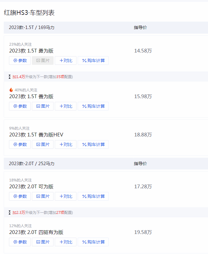 紅旗HS3這款車目前在售的車型共有5款,其官方指導(dǎo)價(jià)14.58-19.58萬元,整體的價(jià)格分布還是較為均勻。