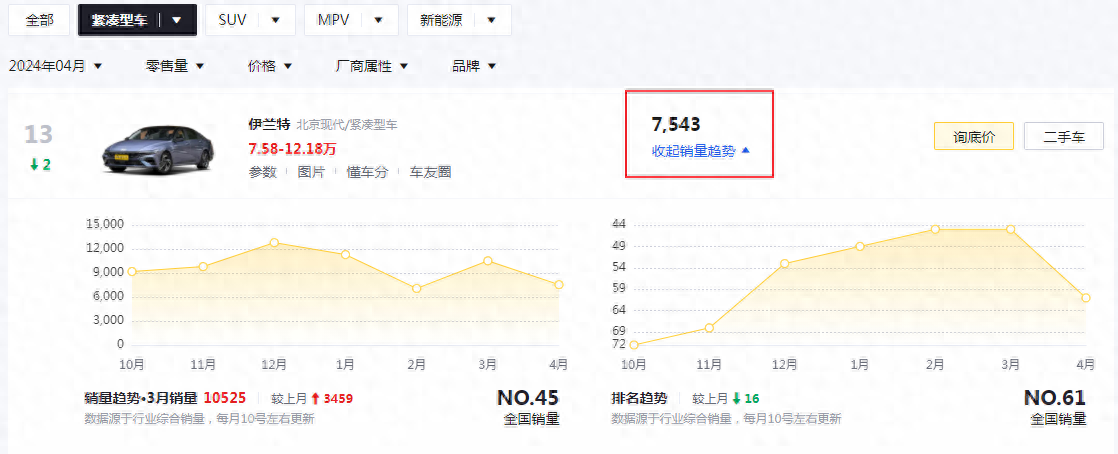 4月銷量7543輛北京現代伊蘭特,銷量較上月有所下降
