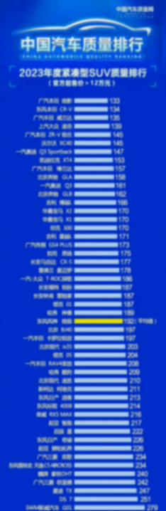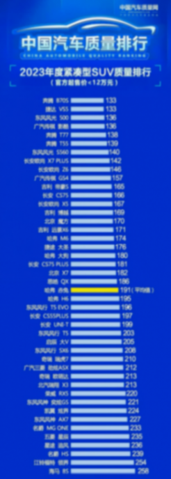 2023年緊湊型SUV質量排行榜已公布,該榜單以中國汽車質量網投訴數據為根據,對上市滿一年的燃油車型(不包含進口車),從投訴故障、缺陷風險、可靠性、安全性、環保性五大方面,進行評估,分數越小,代表綜合表現越好,購車前,先看不吃虧。