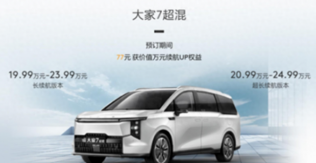 大家7超混車型已在北京車展上亮相并開啟預售,其中,長續航版預售價為19.99-23.99萬元,超長續航版預售價為20.99-24.99萬元,頂配版比純電版優惠4.99萬元。據悉,新車將于6月7日發售,對標廣汽傳祺E8PHEV、艾力紳、本田奧德賽等車型。