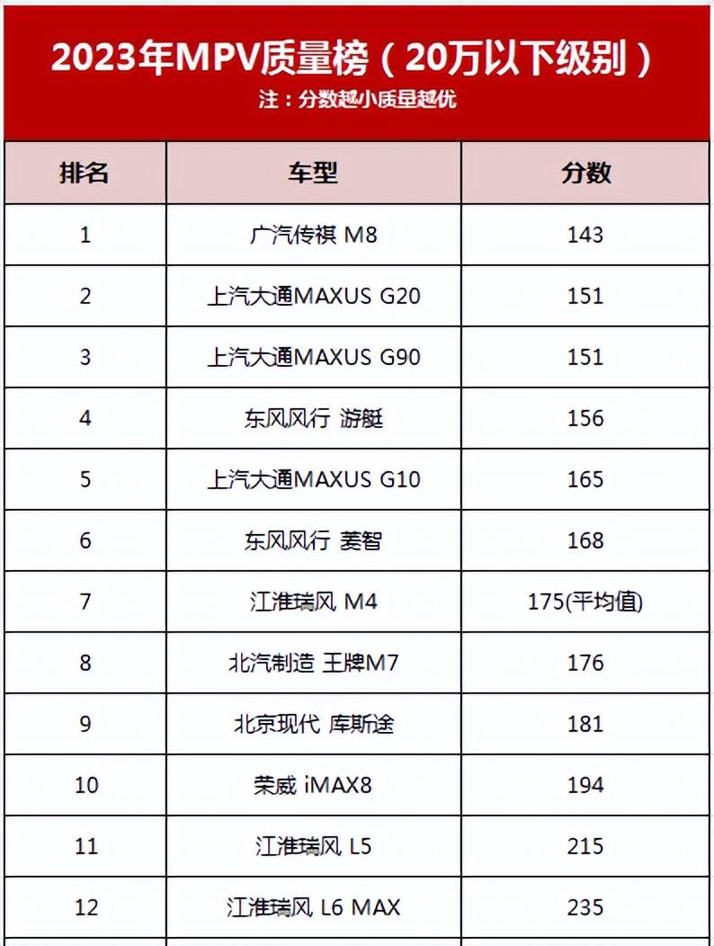 國家市場監督管理總局中國質量報刊社主辦的中國汽車質量網每年都會列出不同車型的質量榜單。中國汽車質量網2023年的MPV質量榜單分為20萬以上與20萬以下兩個級別。