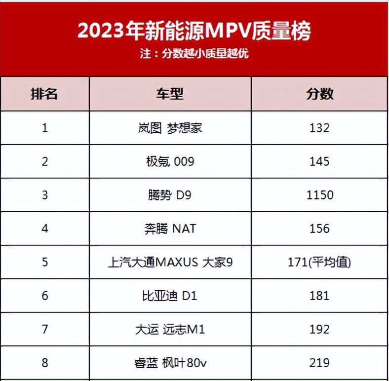而在新能源MPV質量榜上排名靠后的車型也都是一些價位偏低且知名度不高的車型。可見,未來隨著MPV市場的繼續發展,兩極分化與強者恒強的局面可能會進一步加劇。