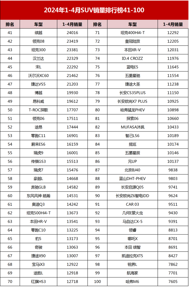 曾經穩居排行榜前五的豐田與本田此次都只有一款車型進入榜單前十。而這已經是日系SUV在這四個月取得的最好成績。