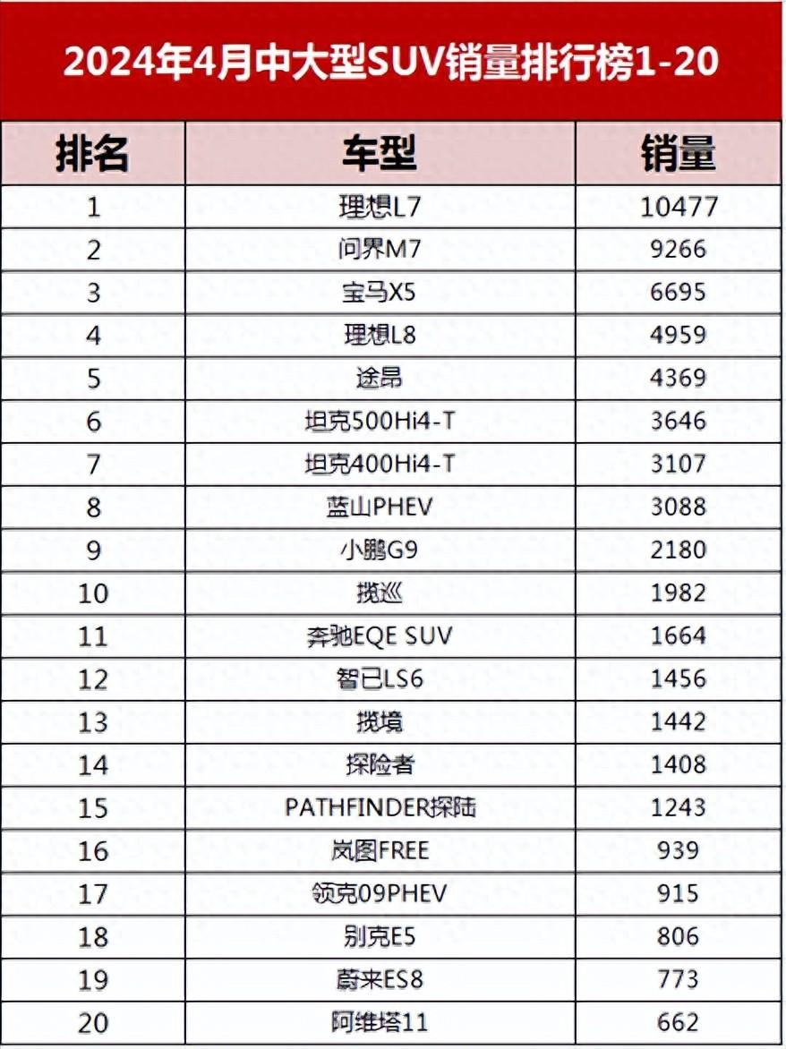 而尺寸相近,價格更高的理想L7在4月則以10477的銷量實現(xiàn)了反超。拿下了中大型SUV銷量榜第一的位置。