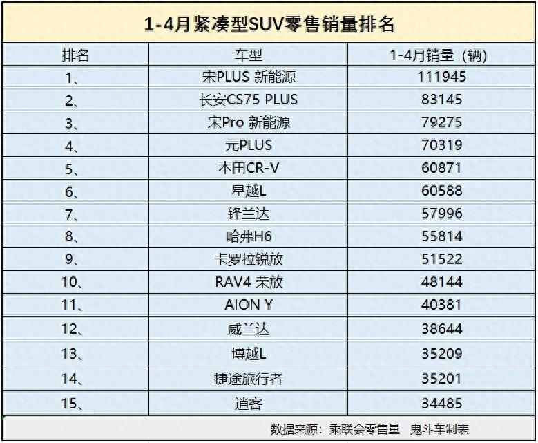 這一點(diǎn),主要體現(xiàn)在銷量上,日前,乘聯(lián)會(huì)發(fā)布1-4月緊湊型SUV零售銷量數(shù)據(jù),鬼哥整理出銷量排名前十五的榜單。接下來,看看哪些緊湊型SUV更搶手?