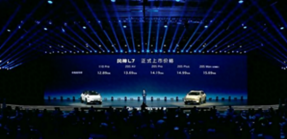 在CLTC工況下,風(fēng)神L7的純電續(xù)航達到了205公里,綜合續(xù)航1500公里,饋電油耗為3.8L/100km。在具體的車型分配上,風(fēng)神L7的售價區(qū)間為12.89萬元-15.69萬元,除了入門版車型的純電續(xù)航為110公里,其余均為205公里版本。