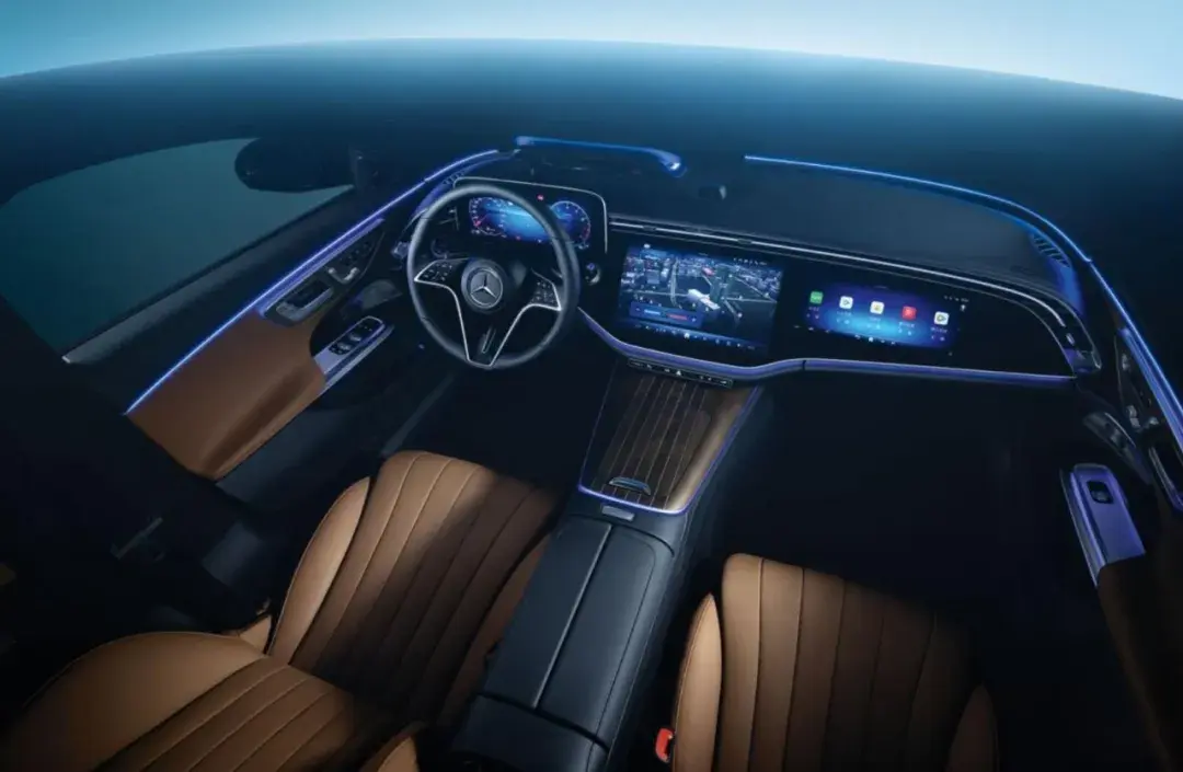 進入車內,E 350 e L的座艙兼具豪華與科技。標配的MBUX超級屏擁有14.4英寸中央顯示屏和12.3英寸前排乘客顯示屏,帶來前衛的視覺體驗。轎車采用棕色楓木飾板,運動轎車則選用黑色岑木飾板,搭配360度環繞式環境氛圍燈,實現隨音樂變化的燈光效果。