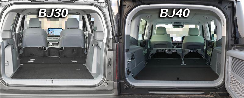 以上只是基礎價格和動力簡單數據羅列,在實際尺寸部分,北京BJ30就有以下犯上的實力。北京BJ30長寬高分別為4730/1910/1790mm,定位緊湊級SUV的數據看上去平平無奇,但其軸距達到2820mm,妥妥的中型SUV車型軸距。從實車視覺上也能看到出來,他并不小。要知道,他的“大哥”BJ40軸距也才2760mm,加上車尾的外掛式備胎,車長數據才僅為4790mm,且由于BJ40的尾門采用側開式布局,導致后備廂容積僅為同級主流水準。加之北京BJ30繼承了大哥的優點之一,后排座墊可掀起放倒靠背,后排座椅折疊后與大哥的后備廂容積可謂不相上下。下面放兩張圖,可以直觀感覺到。
