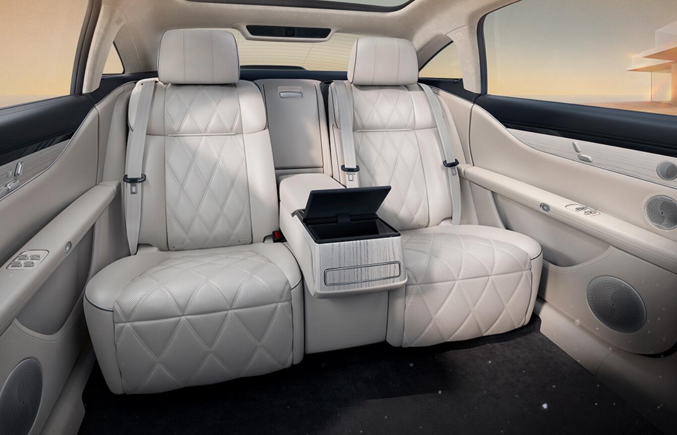 中央扶手箱處還有著翹起的液晶控制屏幕,進(jìn)一步提升了交互體驗(yàn)。全景大天幕,類似于投影屏的機(jī)構(gòu),層次感豐富的門板裝飾肉眼可見的多音源音響,隨處可見的木紋裝飾也提升了豪華的感覺。雖然圖中沒有公布,但例如前排座椅后方Maglink平板接口,后排手機(jī)無(wú)線充電面板,座椅按摩,Napaa真皮等元素都不會(huì)缺席,符合該級(jí)別應(yīng)有的表現(xiàn)。而電冰箱手動(dòng)遮陽(yáng)簾小桌板四車窗雙層夾膠玻璃等都應(yīng)有盡有。