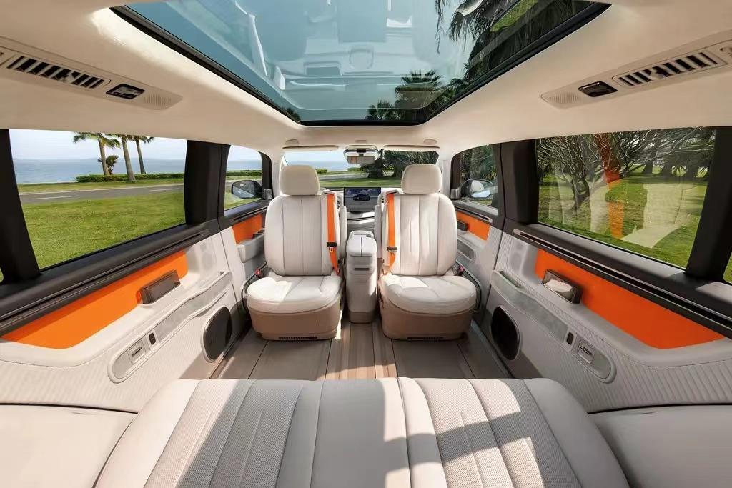 前面說到,極氪MIX沒有設置常規的B柱,因此前后排車門均支持側滑的打開方式,方便停在狹窄的停車位。此外,前排座椅支持270°電動轉向,中央扶手還能夠伸縮變為餐桌,可與后排座椅形成5座會客室式布局,可以說相當有特點。