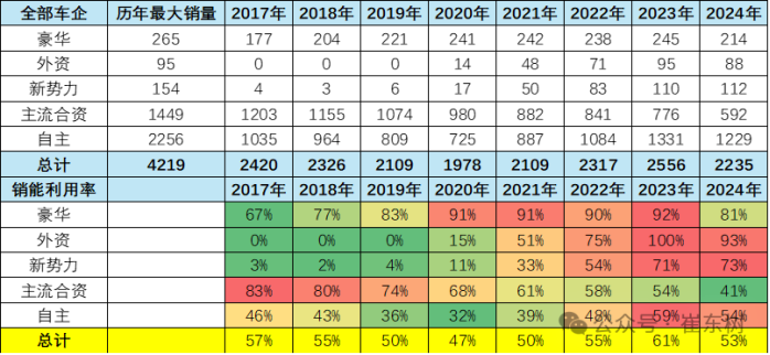 從下圖中國車市近八年的銷量走勢能夠看出,主流合資份額和銷能利用率呈遞減姿態,與之相對應的是自主和新勢力的強勢崛起,這表明頭部車企利用自身規模優勢實現更大的綜合降本,進一步實現銷量最大化,其他車企銷量則被持續邊緣。