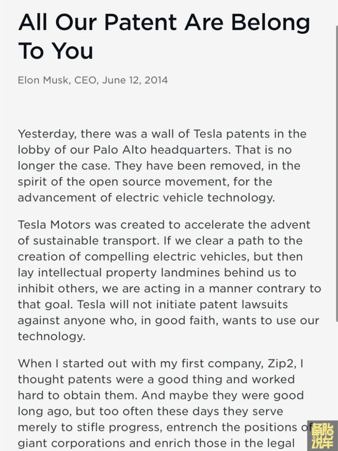 2014年6月12日,特斯拉官網發了一篇文章,叫做《我們所有的專利都屬于你》。