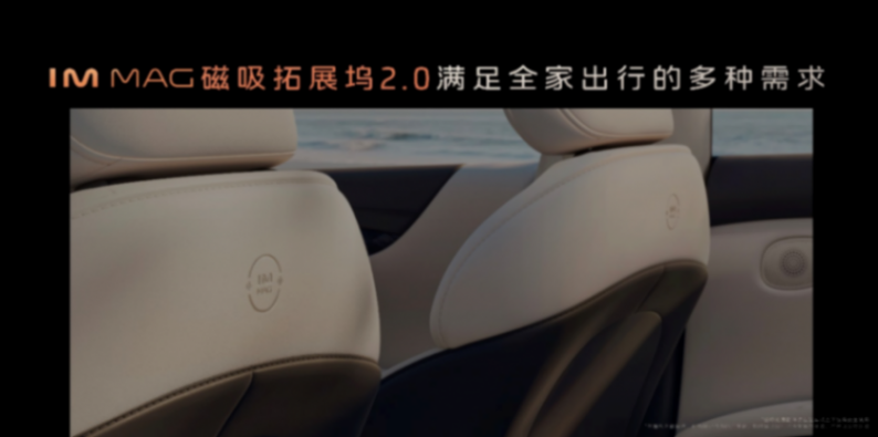 不僅如此,前排座椅后部還有“拓展塢”,而且這次IM MAG磁吸拓展塢對磁吸接口進行了升級,可以外部吸掛一些常規的如屏幕化妝鏡之類的東西,在這里化妝很方便。