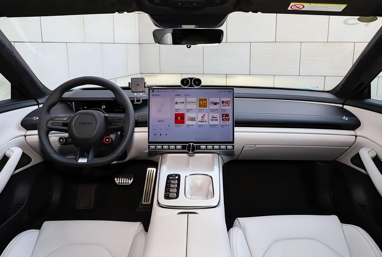 小米SU7的整個氛圍相對簡約,通過環抱式座艙線條以及大面積的皮質包覆提升豪華感。