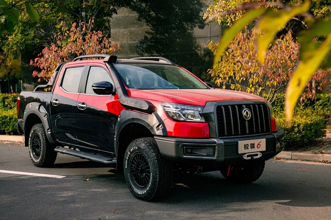 銳騏6 Pro的外觀和銳騏6穿越版比較相似。設計風格比較硬朗,前臉采用了尺寸更大的熏黑直瀑式進氣格柵設計,這一設計具有非常濃郁的美式皮卡風格。帶有鉚釘設計的前后寬大輪眉,熏黑的涉水喉、龍門架和行李架,透露著一股狂野、奔放的氣息。不過,銳騏6穿越版的車身顏色為黑紅色組合,而銳騏6 Pro的申報車型則為白色。