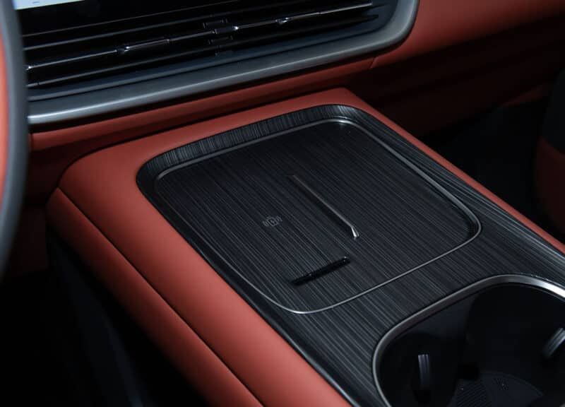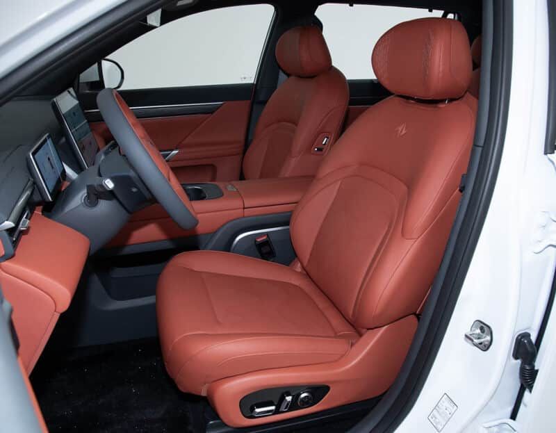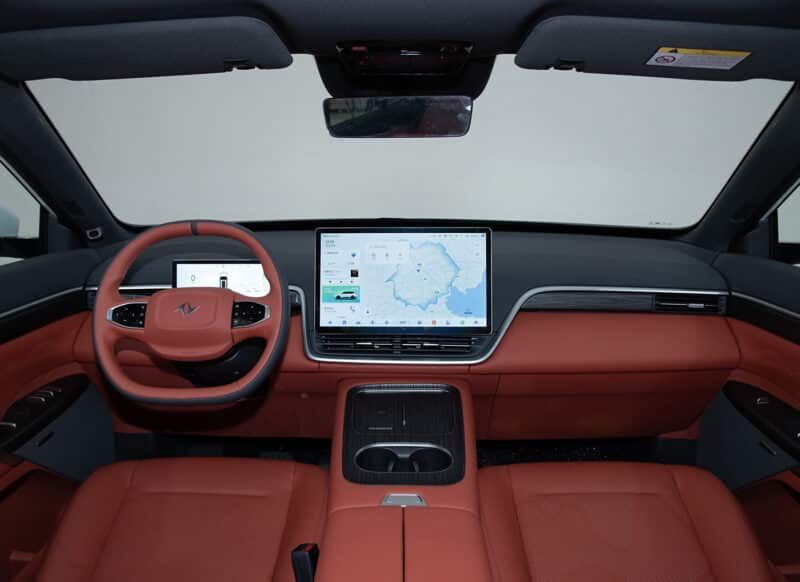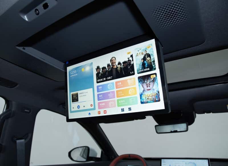東風(fēng) eπ008 的內(nèi)飾似乎變得更有趣了。六座采用2+2+2布局,有米色、黑色、紅色三種顏色可供選擇。對(duì)于國(guó)內(nèi)市場(chǎng)來(lái)說(shuō),紅色的選擇尤其大膽。方向盤(pán)后面是一個(gè)8.8英寸的儀表盤(pán),還有一個(gè)浮動(dòng)的15.6英寸信息娛樂(lè)屏幕。嗶哩嗶哩、快手、騰訊視頻和豆瓣閱讀器都是支持使用的。除了方向盤(pán)之外,中控部分沒(méi)有任何按鈕。此外,配有雙50W無(wú)線手機(jī)充電板和64色氛圍燈,還有一個(gè) 20 揚(yáng)聲器立體聲系統(tǒng),并且汽車配備了流媒體后視鏡,加上采用雙層夾層隔音玻璃的窗戶,可帶來(lái)較為舒適的乘坐體驗(yàn)。